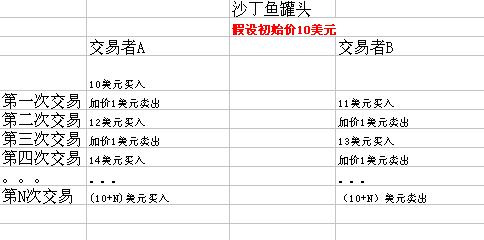 每次交易员A或者交易员B买入后,他都获得了账面的价值,另外一方则获得了实际的利润。当最后某一方打开罐头后,账面价值变成0,他承担了实际的亏损,而另外一方仍然是实际的盈利。
