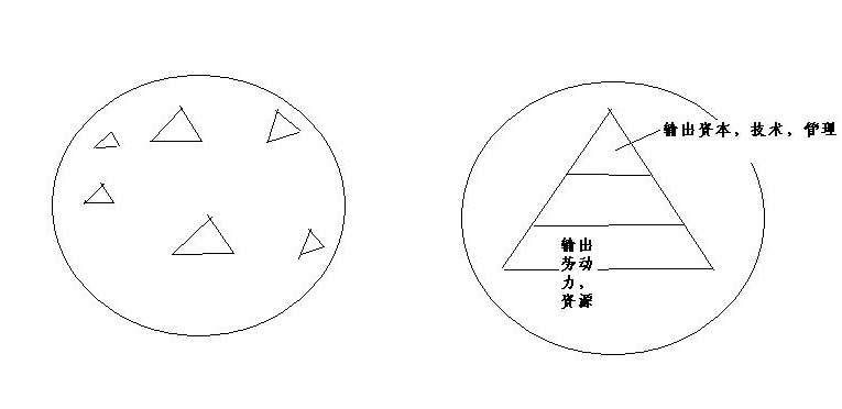 如果我们换一个角度来审视这个问题的话,就会发现,是全球一体化改变了以前的那种一个国家内部阶级分化的状态。以前在一个国家内部存在的资产阶级,中产阶级和无产阶级的分立形势,转变成现在的全球内的资产国家,中产国家,无产国家的形态。以前的各个国家内部的小的金字塔逐渐融合成为了全球的唯一的“大金字塔”。而处于金字塔顶尖的则是美国。它有强大的经济基础,顶尖的科技水平和超强的军事力量,它向全球输出资本 ,技术以及管理 。处于金字塔底部的“无产国家”则提供劳动力,土地和资源。处于金字塔中间位置的国家则根据自身情况,分别提供技术,资本或者劳动力,资源等。
